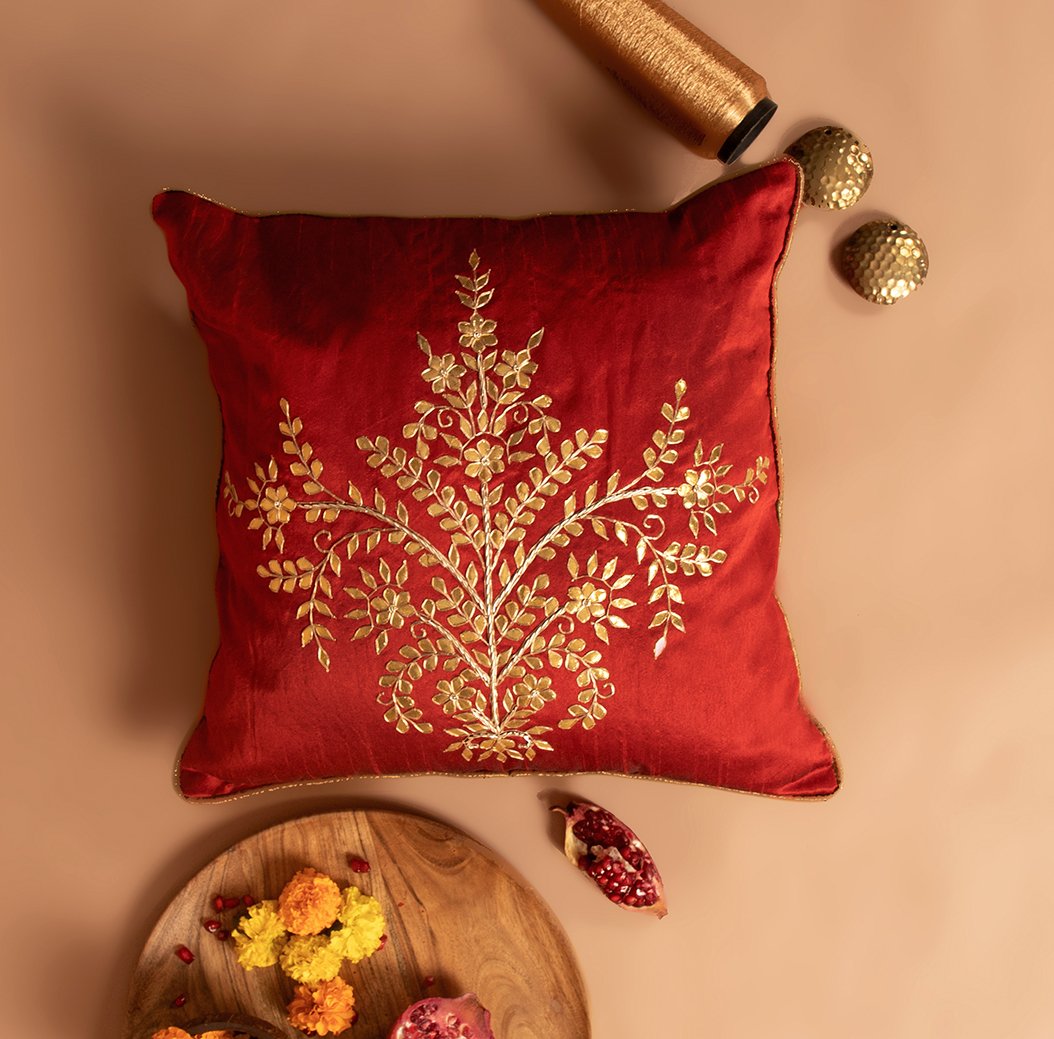 Jharokha- Dupion Silk Gota Patti Handwork Cushion Cover