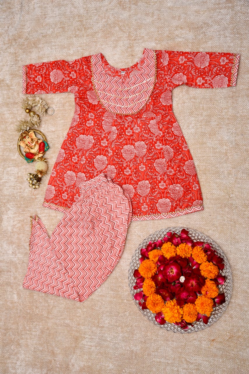 This traditional Indian kids' wear features an intricate floral design in a vibrant tangerine color. The set includes a beautiful kurta with matching dhoti, perfect for girls celebrating cultural festivities pure cotton